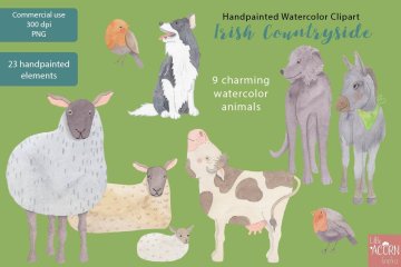 图穷联素材库 » 爱尔兰水彩手绘农场动物剪贴画素材 Irish Country