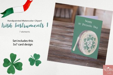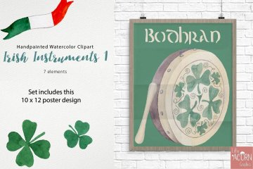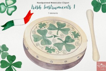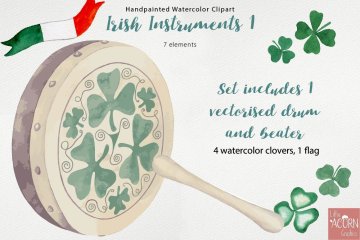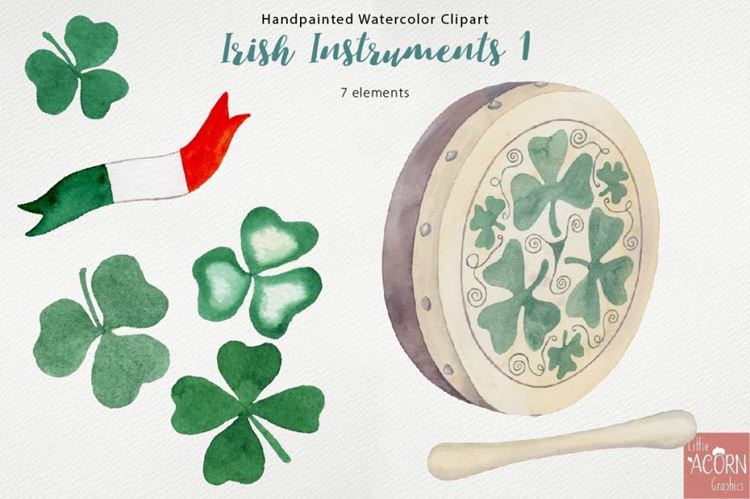 图穷联素材库 » 爱尔兰水彩手绘民族手鼓三叶草剪贴画素材 Watercolor