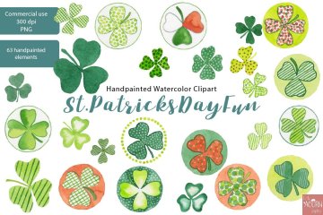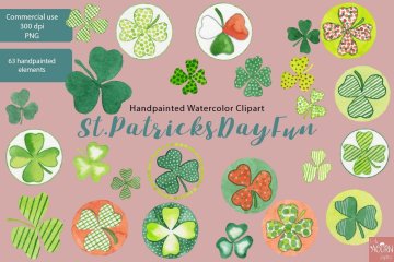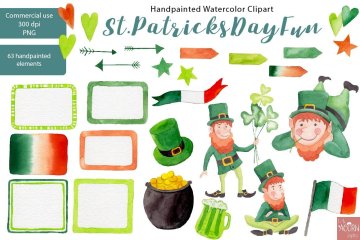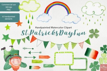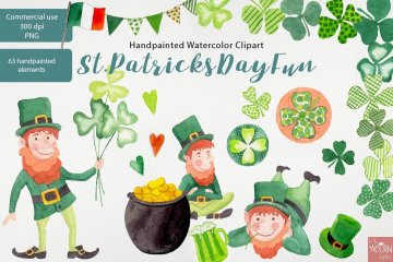 这个ST PATRICKS DAY FUN手绘水彩剪贴画系列已经使用我最喜欢的Schmincke Horadam水彩颜料进行了精心的手绘。我以高分辨率扫描所有图像,并花费大量时间和精力清除每个水彩元素的边缘,以保留真实的水彩纹理并为您的纸张项目提供超干净的透明背景。