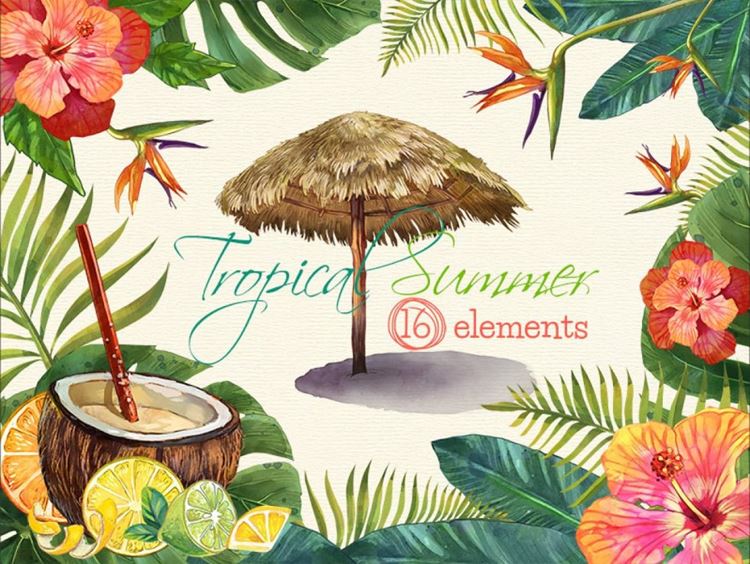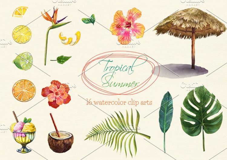 图穷联素材库 » 水彩手绘热带夏季元素剪贴画素材 Tropical Summe