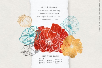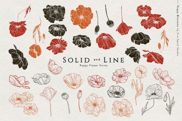 精致而漂亮的罂粟花包括34朵带插图的罂粟花,您可以将其与7种纹理叠加在一起,以创造出美丽而独特的构图。用它们来增强你的品牌、标志设计、婚礼请柬、纺织品图案等等。