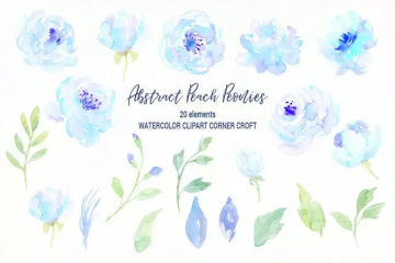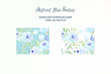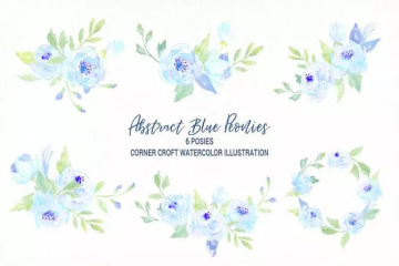 抽象蓝色牡丹水彩剪贴画。这个系列包括水彩蓝牡丹、蓝色花朵、装饰元素、花卉布局。它们非常适合制作婚礼请柬、婚礼卡片、贺卡、剪贴簿、织物印花和纹身图案。