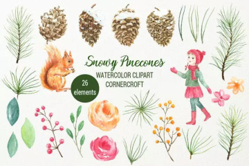 图穷联素材库 » 雪花松果圣诞节主题水彩系列插画套装