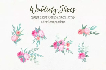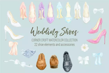 这是婚礼鞋手绘水彩元素剪贴画合集。该系列包括新娘的白色、桃色、粉红色和紫色高跟鞋,新郎的黑色和棕色鞋。前视图、侧视图和后视图有16种鞋子设计,这些设计有18双预制的鞋。有白色领结、钻石戒指和丝带。还有一套花卉收藏的水彩粉色牡丹花、叶子和6个花卉。它们非常适合制作个性化的婚礼照片、新娘女仆印花、婚礼卡片、婚礼邀请和其他艺术印刷品。
