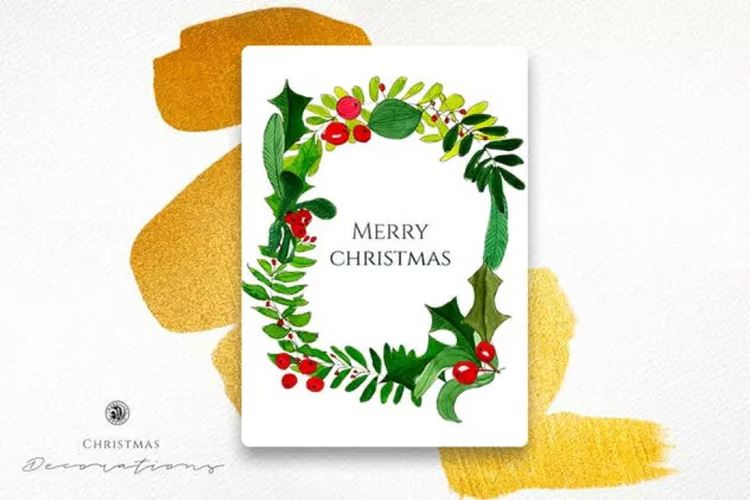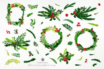 图穷联素材库 » 圣诞装饰绿色花环水彩插画 Watercolor Christ