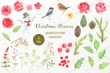 这个系列包括手绘水彩雪人,红玫瑰,鲜花,冬青和浆果,松树和松果,鸟类(知更鸟和山雀)和插花等动植物插画素材。