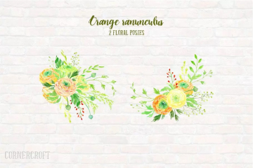 这组合集包括了橙色毛茛,橙色花朵,黄色毛茛和装饰元素,它们是DIY婚礼请柬,博客,花卉信件,艺术打印,贺卡和墙壁艺术的完美素材。