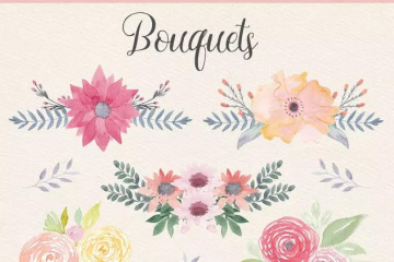 此套装包含40多种水彩花卉,约40种花卉元素(树叶,树枝),7种水彩花束,12种装饰边框,20种手绘黄色横幅/丝带,6种水彩纹理/背景。
