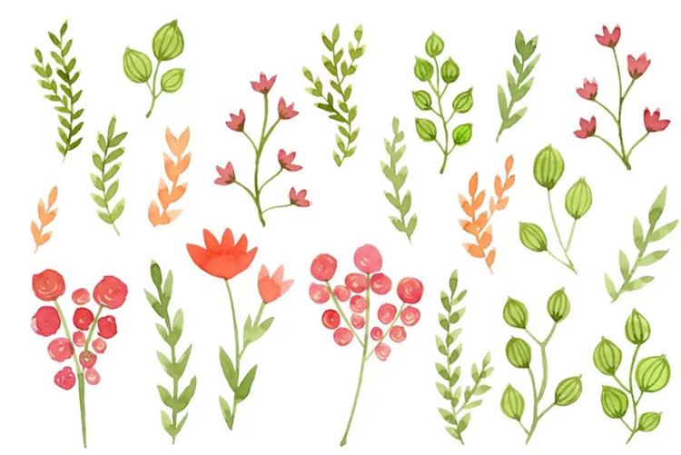 花卉元素是手工绘制的,每一幅图像都是一个单独的PNG文件,300 dpi,没有背景。