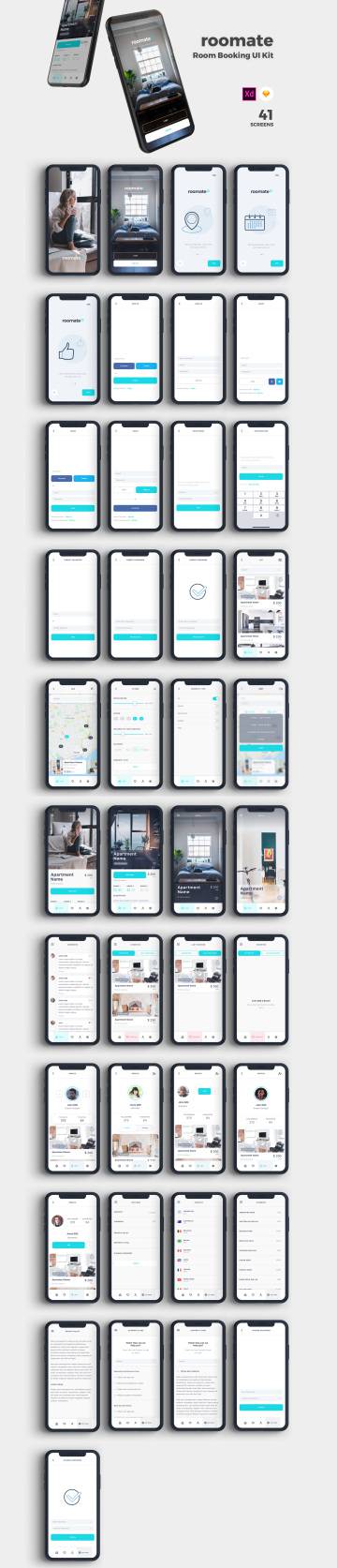 Roomate是一款使用Sketch和Adobe XD设计的Room Finder App UI工具包。每个屏幕都是完全可定制的,并且符号组织良好。它包含41个完美分层和组织良好的屏幕。