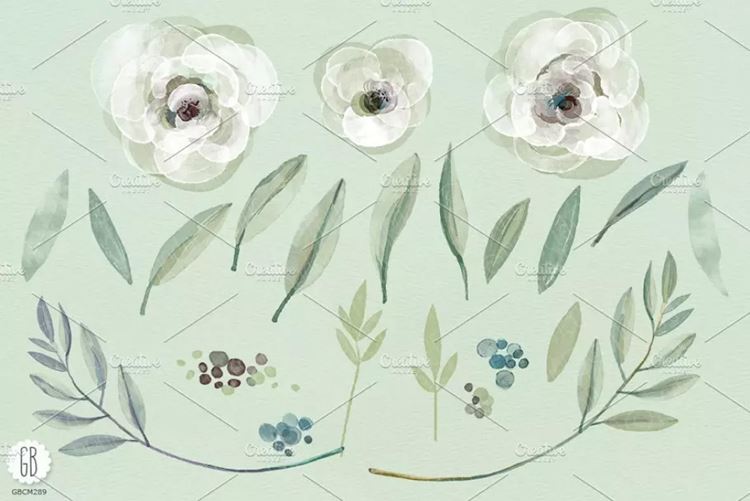 这个项目包括23个手绘水彩元素:3朵白玫瑰,叶子和树枝。总共48个独立的数字文件。