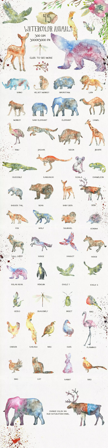 这是一组有45个水彩画动物的剪贴画合集,他们是用湿水彩技术作画的。可用于标志设计,名片,头像,生日请柬,婴儿淋浴卡,网页设计,海报、传单等等。