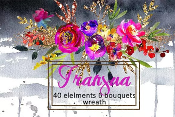 紫色,粉红色和红色的花束带有金色的闪光触感,还有分开的花,树枝,叶子。这套手绘水彩花卉集可用于设计冬季婚礼或婴儿淋浴邀请卡,徽标,博客和网站。