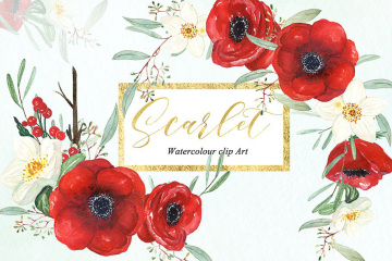 这组水彩剪贴画是鲜红的海葵和嫩白的冬季玫瑰的优雅组合,带有柔软的绿色桉树枝条,可用于婚礼请柬,贺卡,标志和博客等。