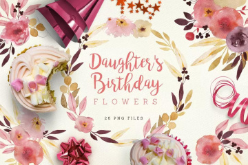 生日主题水彩花卉剪贴画 Daughter’s Birthda