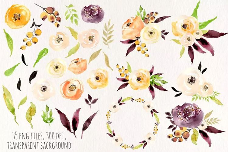 35 个PNG手绘水彩图形元素(6个具有透明背景的花卉组合)。