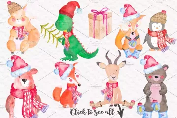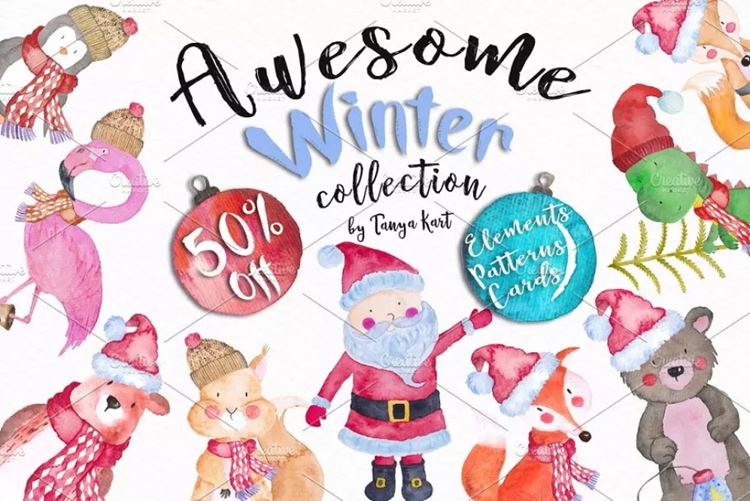 可爱冬日动物形象水彩图案 Cute Winter Anima