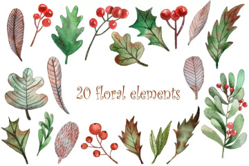 20个花卉元素(15片叶子和5个带浆果的树枝)