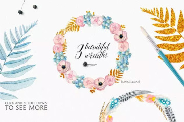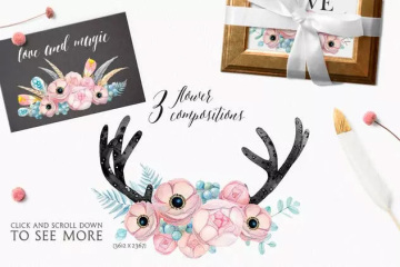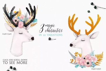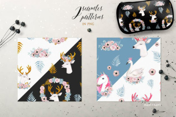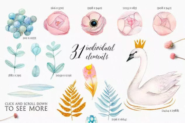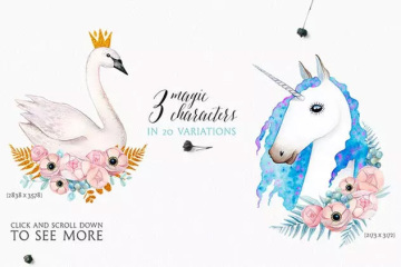 这组合集包括了长着彩色鬃毛的独角兽、白鹿和精灵天鹅——它们都是来自梦境之地的神奇生物。快使用这些插图给您的下一个创意产品添加一些魔力吧:)