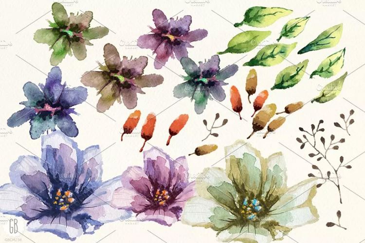 这组高质量的手绘水彩花卉合集包括了30个花卉元素,总共60个独立的数字文件。