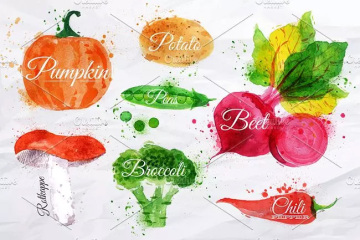 萝卜、洋葱、土豆、香菇等蔬菜上绘有水彩污渍。水彩蔬菜种类包括:玉米,花椰菜,辣椒,茄子,卷心菜,胡萝卜,番茄,豌豆,南瓜,甜菜,辣椒,黄瓜,生菜,樱桃番茄,芦笋,橄榄,罗特卡,朝鲜蓟,黑橄榄,韭葱。