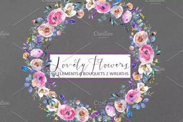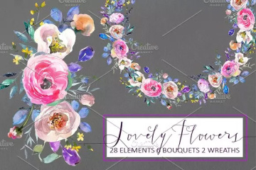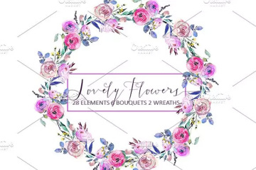 这组合集带有粉红色和紫色的水彩牡丹和玫瑰花束、花环等元素。非常适合用于设计婚礼,婴儿浴邀请卡,贺卡,印刷品,墙壁艺术,标志,网页和博客设计等更多项目。