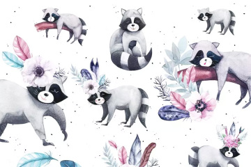 羽毛和浣熊水彩剪贴画 Watercolor Feathers