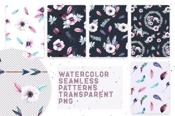 9个带有透明背景的羽毛、斧头、花朵等PNG无缝图案。
