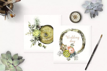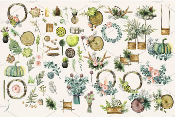 该素材包包括72个PNG文件,有水彩花束、花枝、花环、树桩花、水彩红鹿、木板材料等等。