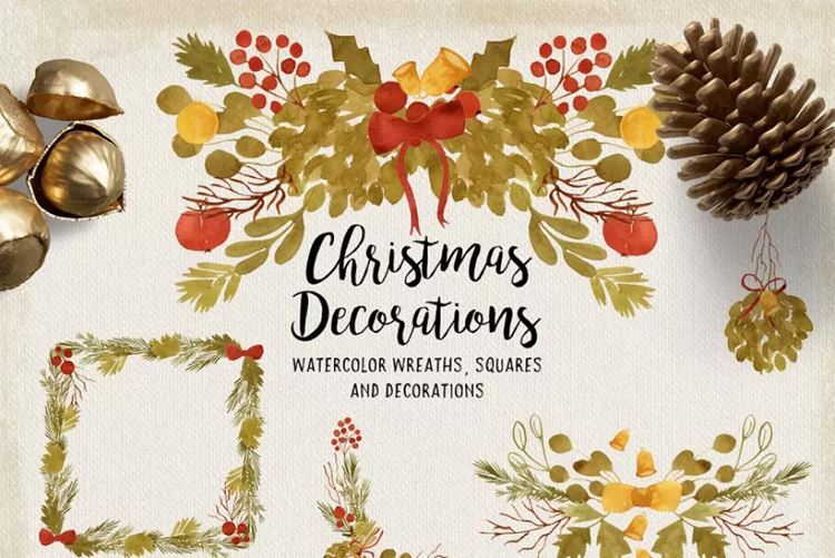图穷联素材库 » 水彩画圣诞装饰品 Watercolor Christmas
