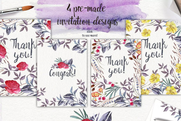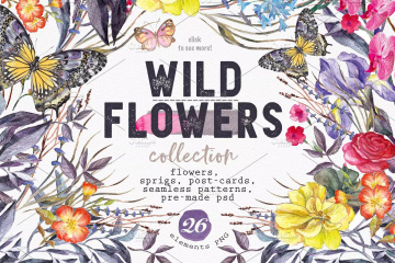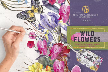 这组DIY水彩野花的图形元素包括花卉,花环,花束,PNG叶子,还有预先制作的明信片和无缝图案。