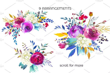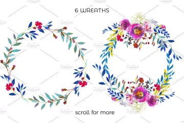这组浪漫的水彩剪贴画合集带有花卉花环等元素,包括了背景、框架、无缝的图案和设计文件等素材。非常适合用于设计婚礼请柬,婴儿淋浴邀请卡片,贺卡,打印项目,墙壁艺术,logo,邀请函,网络和博客设计等项目。