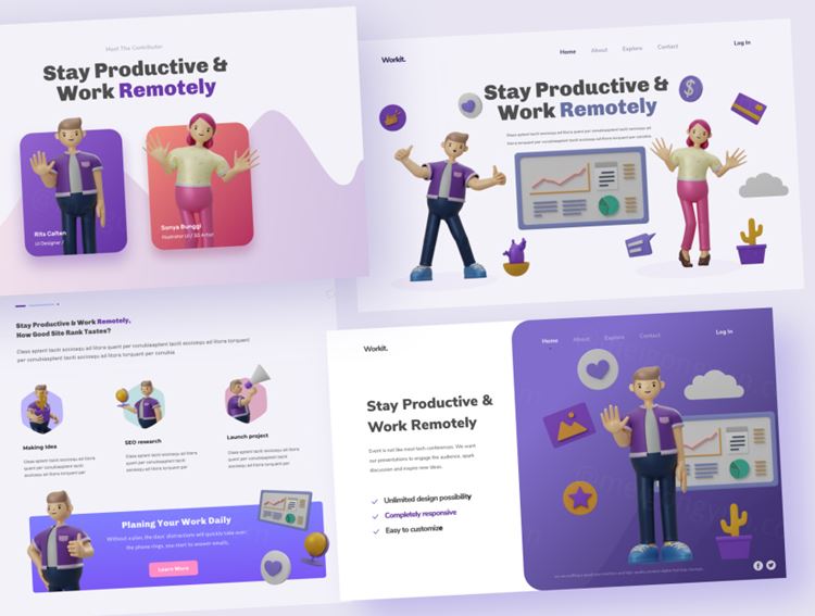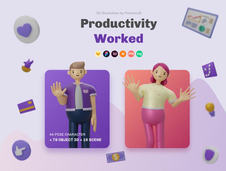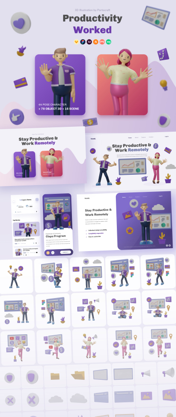 富有成效的工作是一个3D插图,具有42个姿势和72个带有2个视点的附加对象。此插图非常适合UI,网站,移动和演示。