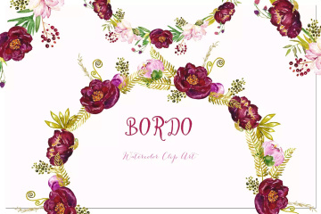 水彩牡丹花卉剪纸艺术数字剪贴画 Peony Bordo. W
