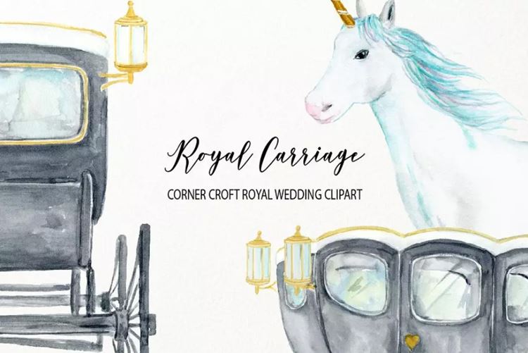 这组合集由皇家婚礼马车,白色独角兽,锡罐,白色婚礼花卉等手绘水彩插图组成,车厢有两种设计,一个侧面和一个背面。也有与独角兽和花的马车组合。