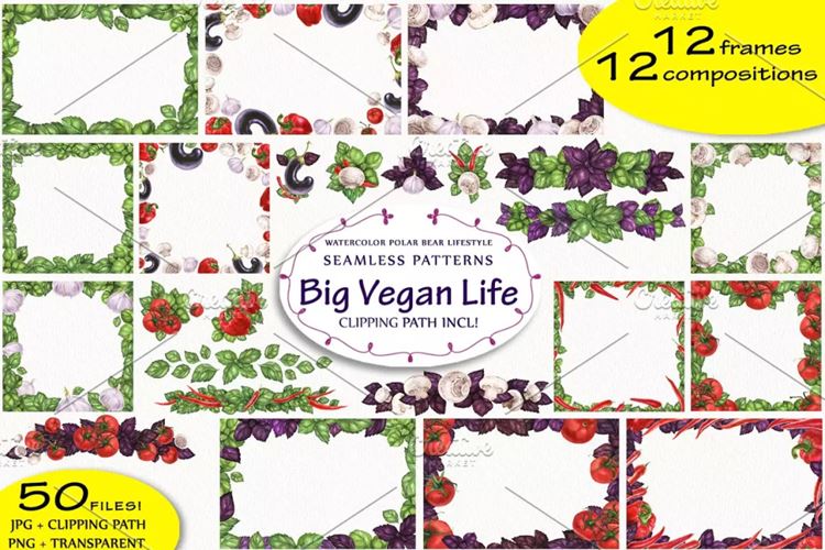 营养蔬菜水彩元素插图合集。蔬菜、方形框架和菜单框架、标题花环、胸花和无缝图案。