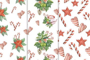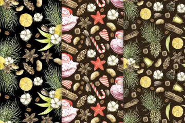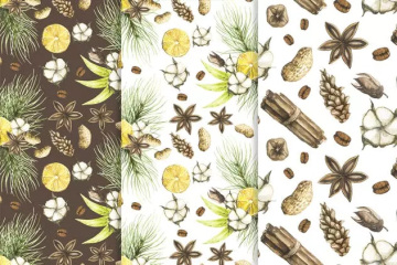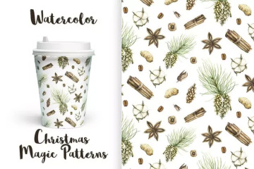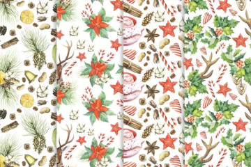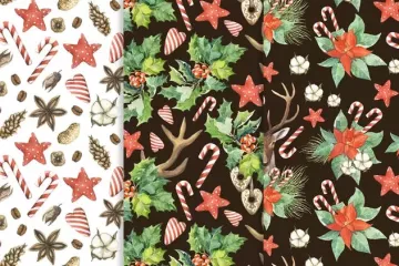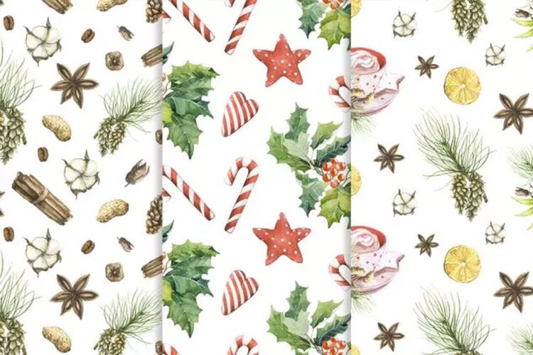 这组合集包含了19个JPEG水彩无缝图案,包括了松果、姜饼、松枝、鹿角等元素。