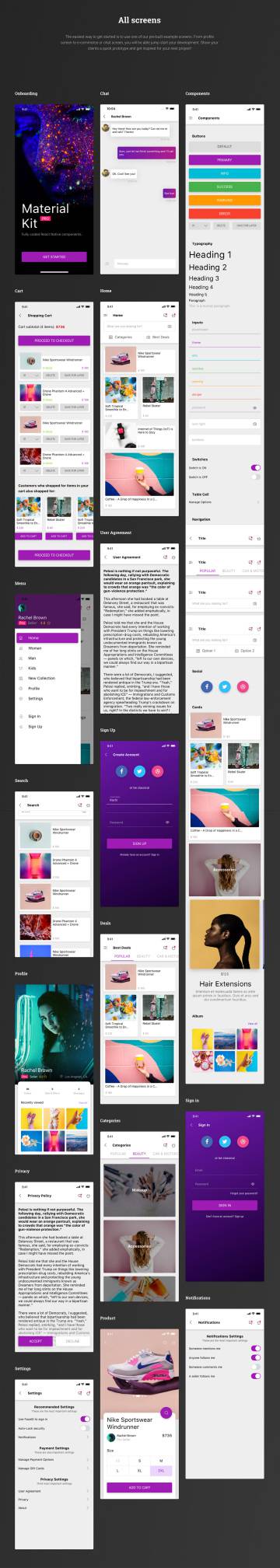 Material Kit Mobile包含大量组件和卡。将移动应用程序组合在一起从来就不比将不同组件匹配在一起更容易。从配置文件屏幕到完全可用的购物车,您可以轻松自定义和构建屏幕。我们为您创建了多个选项,可以将它们组合在一起并自定义为像素完美屏幕。