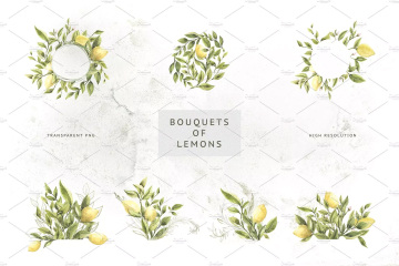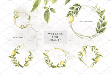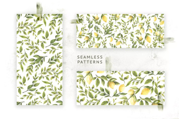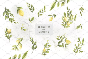 图穷联素材库 » 柠檬 绿色枝叶水彩插画 Lemons Greens