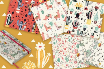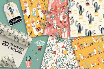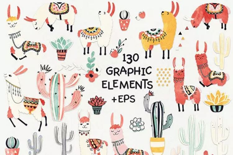 图穷联素材库 » 美洲驼和仙人掌水彩剪贴画 纹理 Llamas and Cac