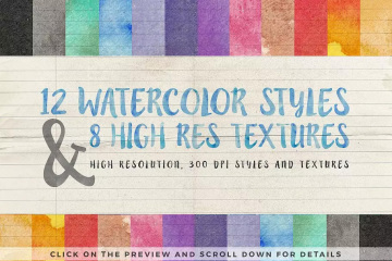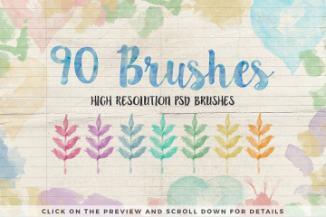 在这组合集您会发现各种各样的形状的笔刷和样式,非常容易在Photoshop中安装和使用。原始的水彩元素也包含在一个单独的PSD文件中,您可以在您的项目中拖放使用它们!