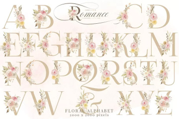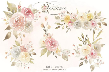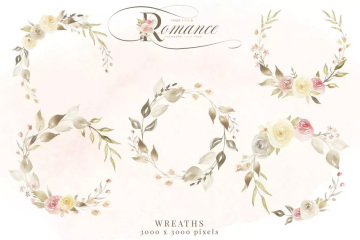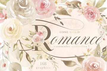 这组玫瑰金色浪漫水彩画系列以大量柔和的手绘水彩画花卉和树叶为特色,共168幅图形,包括花卉图案、花环、花束、花叶等。