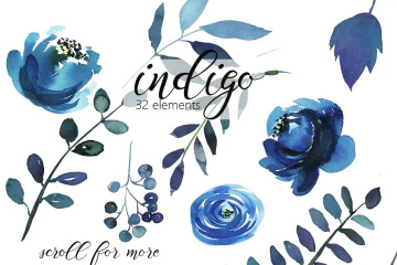 靛蓝水彩花卉剪贴画 Indigo Blue Watercol