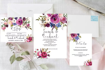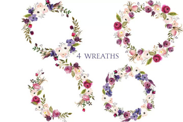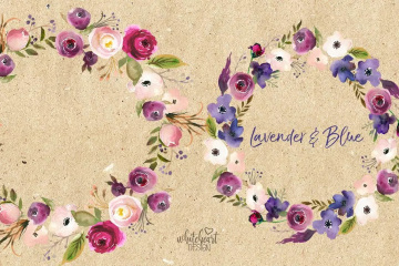 这组新的薰衣草色与蓝色水彩花卉剪贴画合集包括超过50幅图像:花束,花环,图案和元素。
