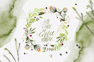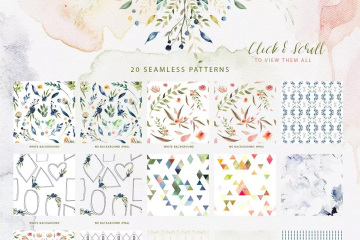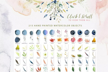 这组巨大的包裹里装满了漂亮的手绘水彩画图形和图案,包括215个元素,21个预先设计的元素,56幅插图,17幅图案。
