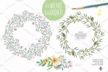 这组水彩动物&花卉插画合集包含了超过110种元素,包括预制的商标、花朵、花环和图案,这个异想天开的组合可以为任何设计项目注入神奇的色彩。
