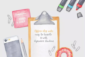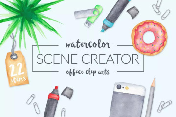 这组剪贴画与模板合集包括了22个手绘水彩办公室剪贴画和5个预制场景,所有的办公用品都是手绘水彩画,您你可以直接使用5个预制场景或创建自己的场景。