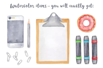图穷联素材库 » 手绘水彩办公用具剪贴画 Watercolor Scene C