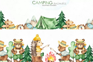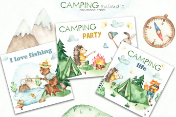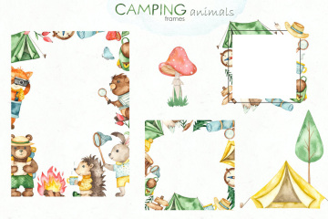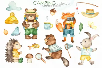 时尚清新可爱手绘水彩风格夏令营动物插画大集合-JPG,PNG,PSD,水彩孩子们与狐狸摄影师,熊旅行者,带蝴蝶网的兔子,海狸渔夫,坐式刺猬以及帐篷,背包,指南针,放大镜,火等一起露营的动物。该套产品还包括婴儿洗澡卡,预制卡,框架,无缝图案和边框。高品质的手绘剪贴画,为您的最佳想法。