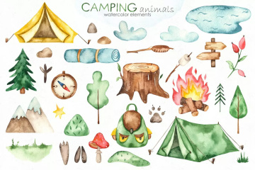 图穷联素材库 » 时尚清新可爱手绘水彩风格夏令营动物插画大集合-JPG,PNG
